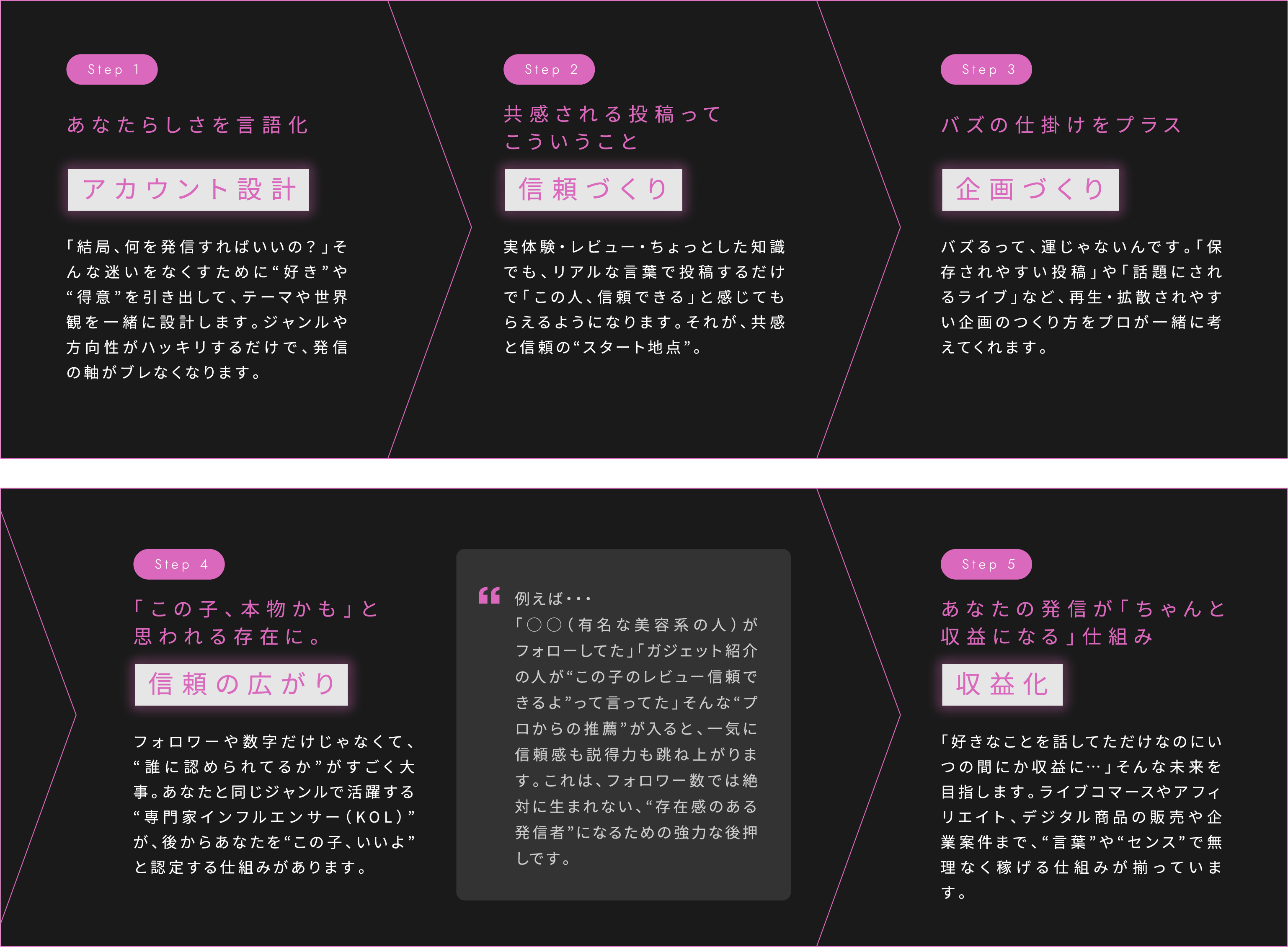 機械的なマニュアルではなく、今もSNSの現場で数字を出しているプロがあなたの発信を一緒に設計・プロデュースします。